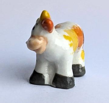 Die Kuh ist in einem natürlichen Farbton gehalten und hat gelbe und hellbraune Kleckse auf ihrem Fell, was ihr einen besonderen und lebendigen Charakter verleiht.